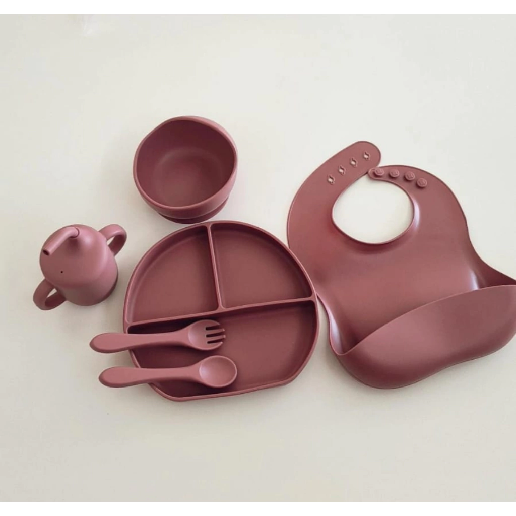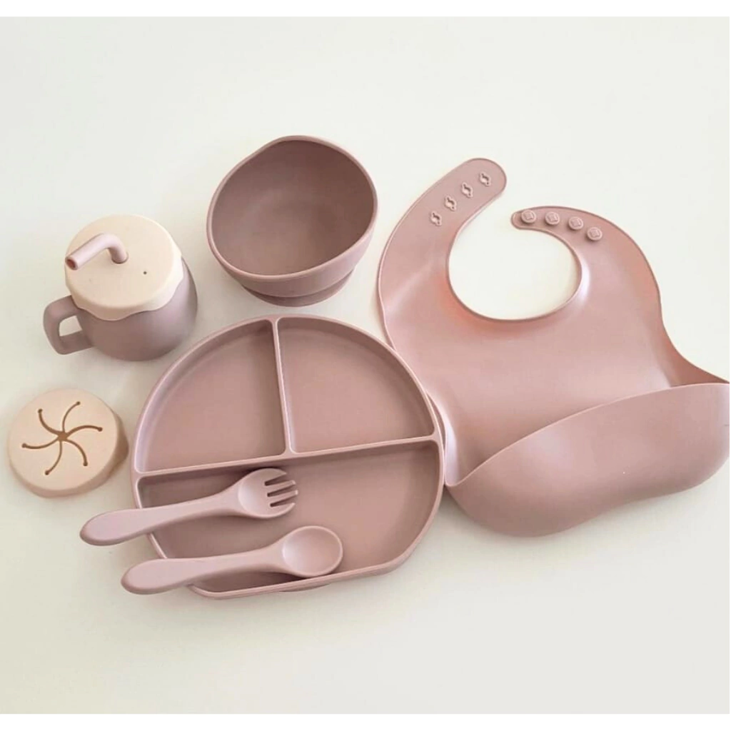 El set incluye: Plato con divisiones + Tenedor y cuchara + Vaso con asas y sorbete o clásico según el modelo seleccionado + Bowl + Babero con bolsillo delantero.